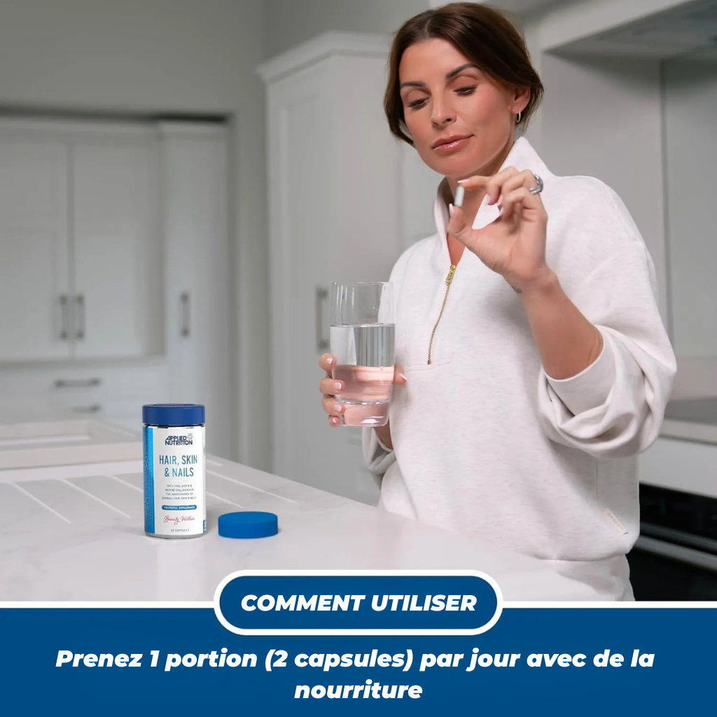 مع الزنك والبيوتين وحمض الهيالورونيك والكولاجين البحري للحفاظ على الشعر والبشرة والأظافر الطبيعية