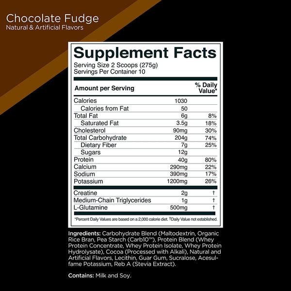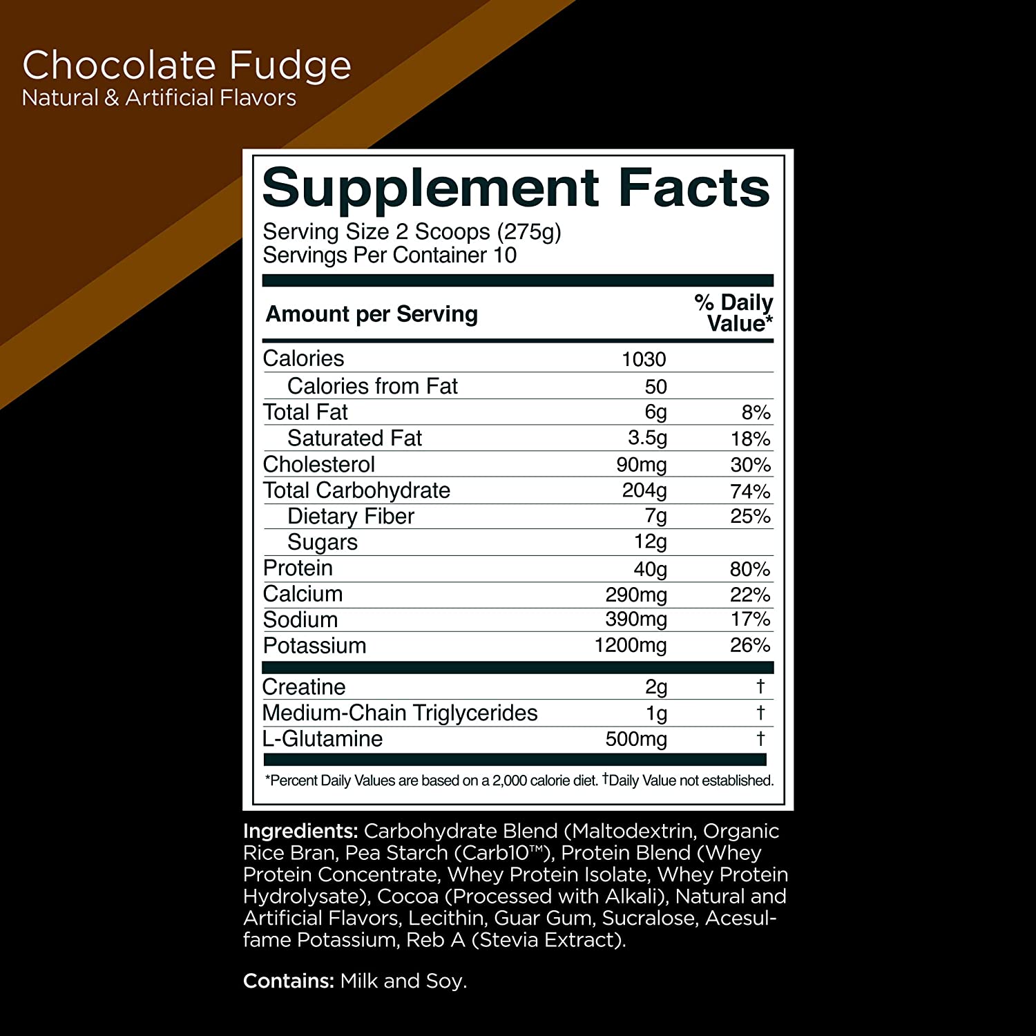 يحتوي بكل ( 2 سكوب ) على : سعرات حرارية : بروتين : 1020 سعر حراري . كارب :203 ج . سكر :7 ج . دهون : 4 ج . كرياتين : 2 ج . فيتامينات و معادن : 17 نوع . دهون MCT صحية : 1 جرام