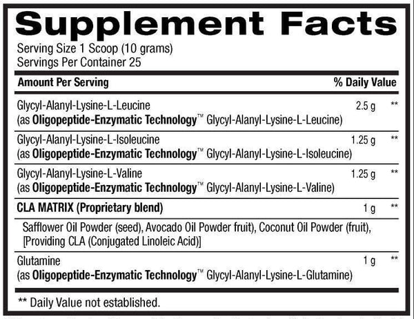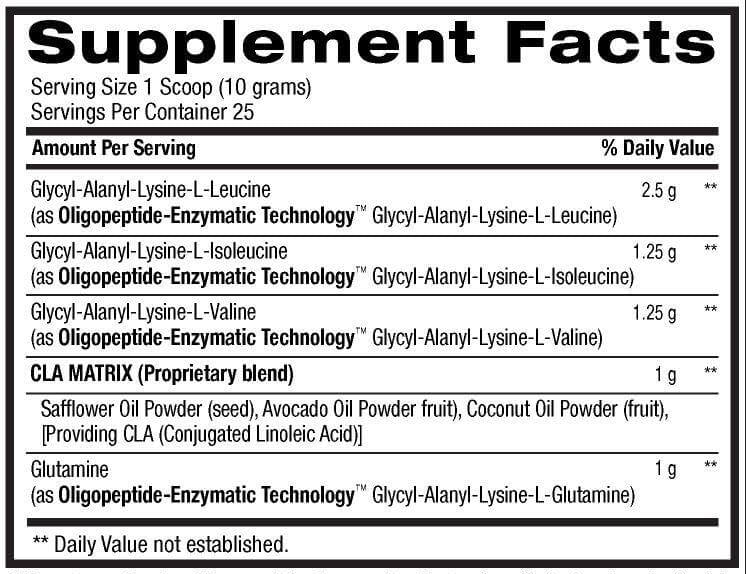 Ingrédients du produit : Il contient un mélange d'acides aminés essentiels et non essentiels : leucine, isoleucine, valine, lysine, arginine, thréonine, phénylalanine, histidine et tryptophane.